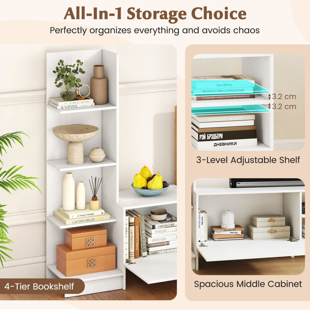 Integrated Bookshelf Feature: For more storage, the TV cabinet features a built-in 4-tier bookshelf. This design not only saves space but also allows you to display books, decorative items, and essentials right where you need them, effortlessly enriching your living space.