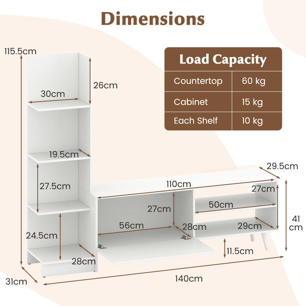 Elevate your entertainment space with a sleek TV stand boasting a spacious 110cm countertop for TVs up to 50 inches. It perfectly organizes everything and avoids chaos. Store media devices and accessories neatly with a 3-position adjustable shelf and an enclosed cabinet. Maximize storage in style with an integrated 4-tier bookshelf. The robust metal legs and 2 anti-tipping kits ensure stability. The media console cabinet can support up to 135kg, while its protective foot pads prevent floor scratches. Embrace its modern aesthetic that seamlessly blends with any decoration, thanks to screw hole covers that maintain a sleek appearance. This versatile TV cabinet can be the perfect addition to various spaces, from the living room to entryways.