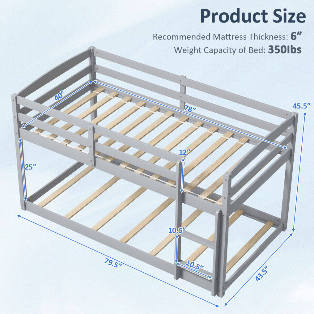 ● Space-saving Floor Bunk Bed: This low bunk bed is specifically designed with a sturdy vertical structure, making full use of floor space and perfect for house with low ceiling. The wooden bunk bed provides 2 twin size beds for sleeping and is perfect for multiple-child family.