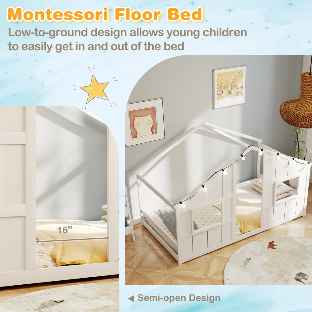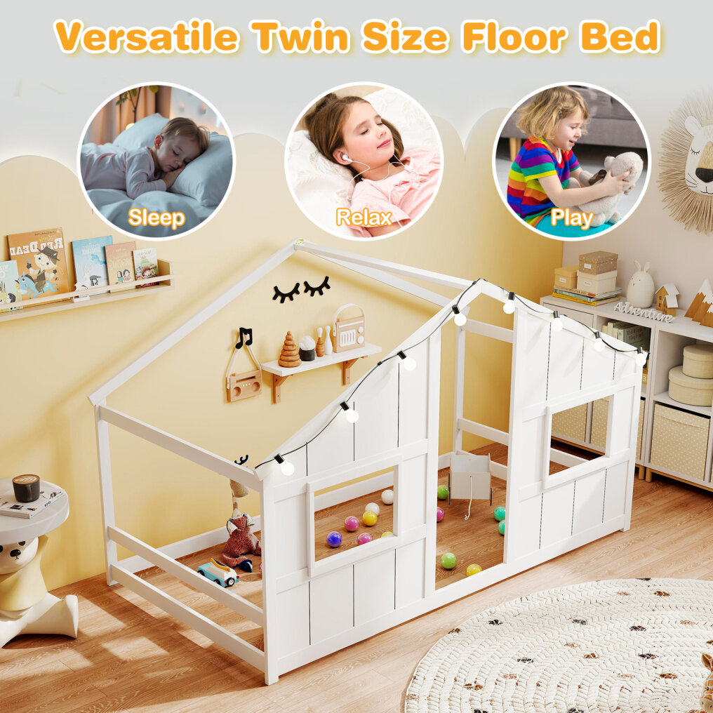 ● Multiple Purposes: The twin size bed is designed as a slat-free floor bed, helping little sleepers transition to independent sleep. It also doubles as a playhouse, providing a perfect spot for kids to read, play, and explore.