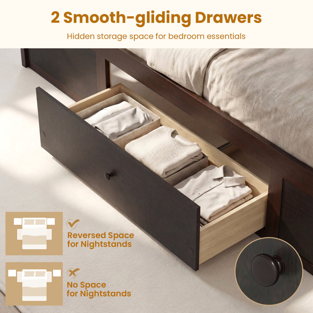 ● Cleverly Designed Storage Drawers: This platform bed features 2 smooth-gliding drawers ideal for neatly organizing clothes, linens, and personal essentials. It is designed with ample nightstand clearance, ensuring the drawers can be accessed and opened fully without any obstruction.