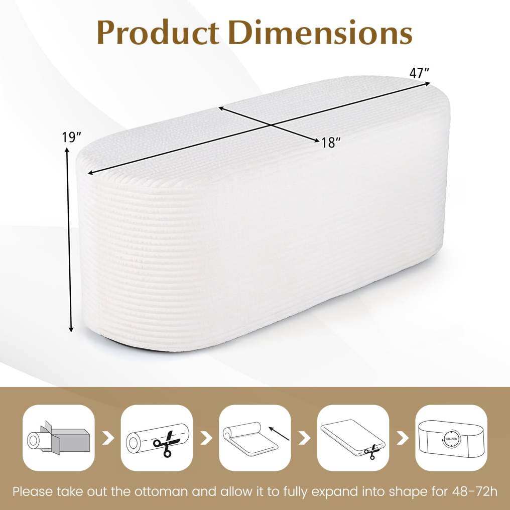 ● No Assembly Needed: This ottoman comes compressed. Just unroll it flat and give it 48-72 hours to fully expand to its original shape. No assembly is required, making it quick and easy to add comfort and style to your space.