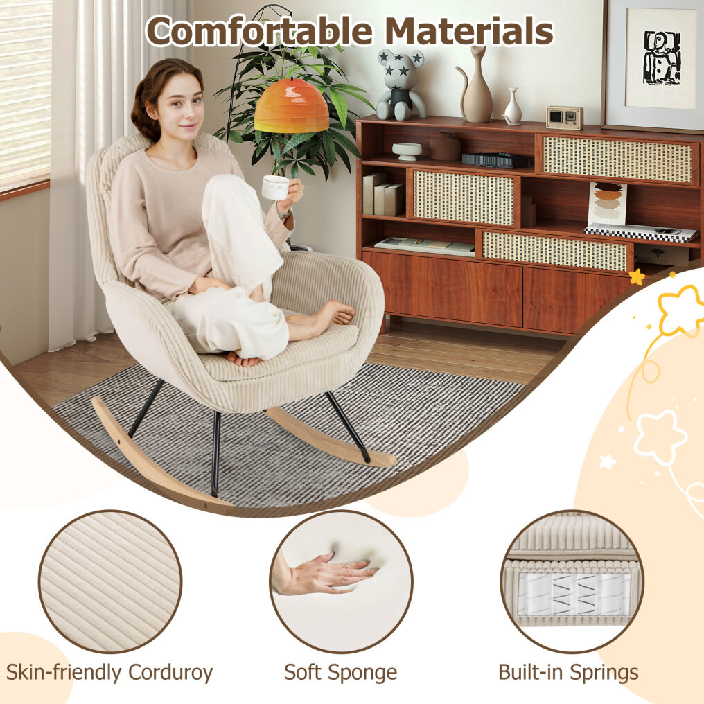 The accent armchair is perfect for rocking your baby to sleep or simply unwinding after a long day. The backrest and seat are upholstered in luxurious corduroy and padded with elastic sponge for a skin-friendly and comfy touch. The metal frame and solid rubber wood feet keep the chair strong and sturdy. The modern design and simple colors make it a versatile addition to any office, bedroom, nursery, or living area. Whether you're feeding your baby or reading a book, the rocking chair will be a perfect choice.