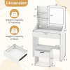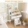 ● Ample Storage Space: Featuring 3 open shelves, a spacious desktop, 2 drawers, and a cushioned storage stool with a hidden compartment, this vanity desk and stool set provides generous space for cosmetics, jewelry, hair tools, and daily essentials.