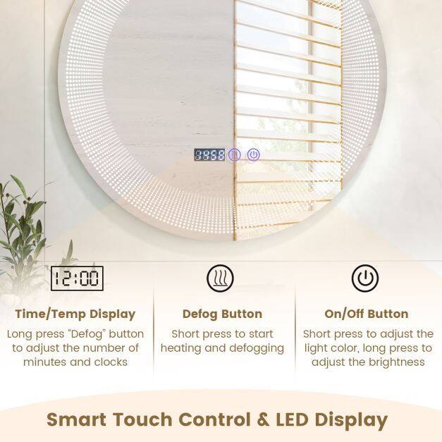 Smart Touch Control and LED Display: Time/temp display: long press “Defog” button to adjust the number of minutes and clocks. Defog button: short press to start heating and defogging. On/off button: short press to adjust the light color, long press to adjust the brightness.