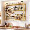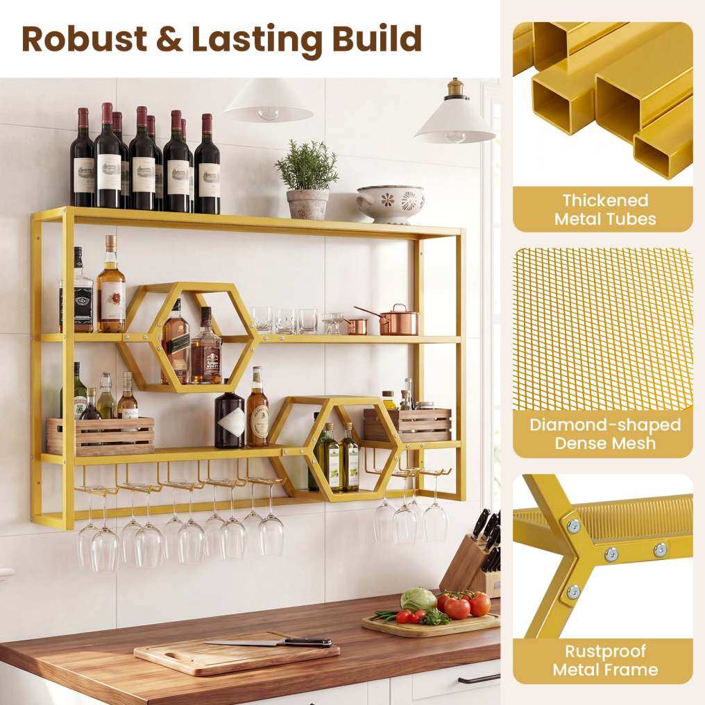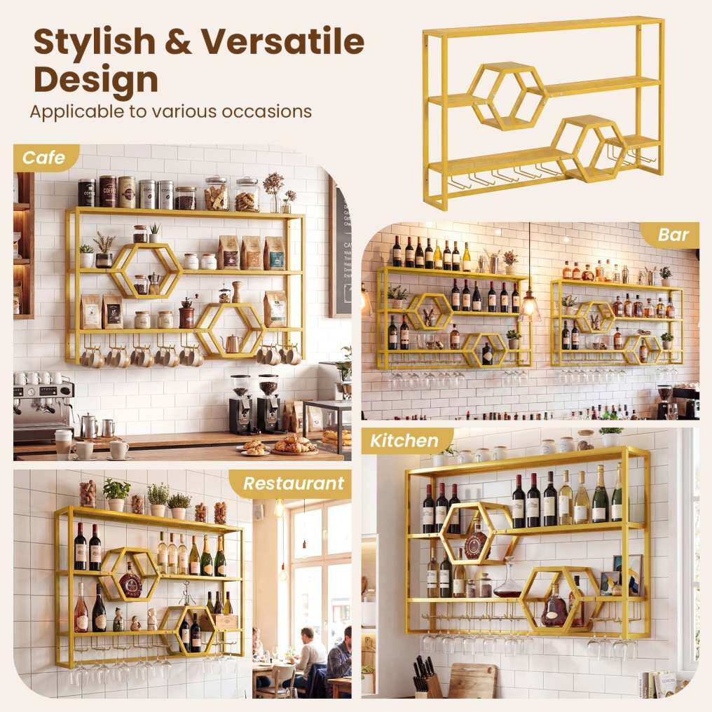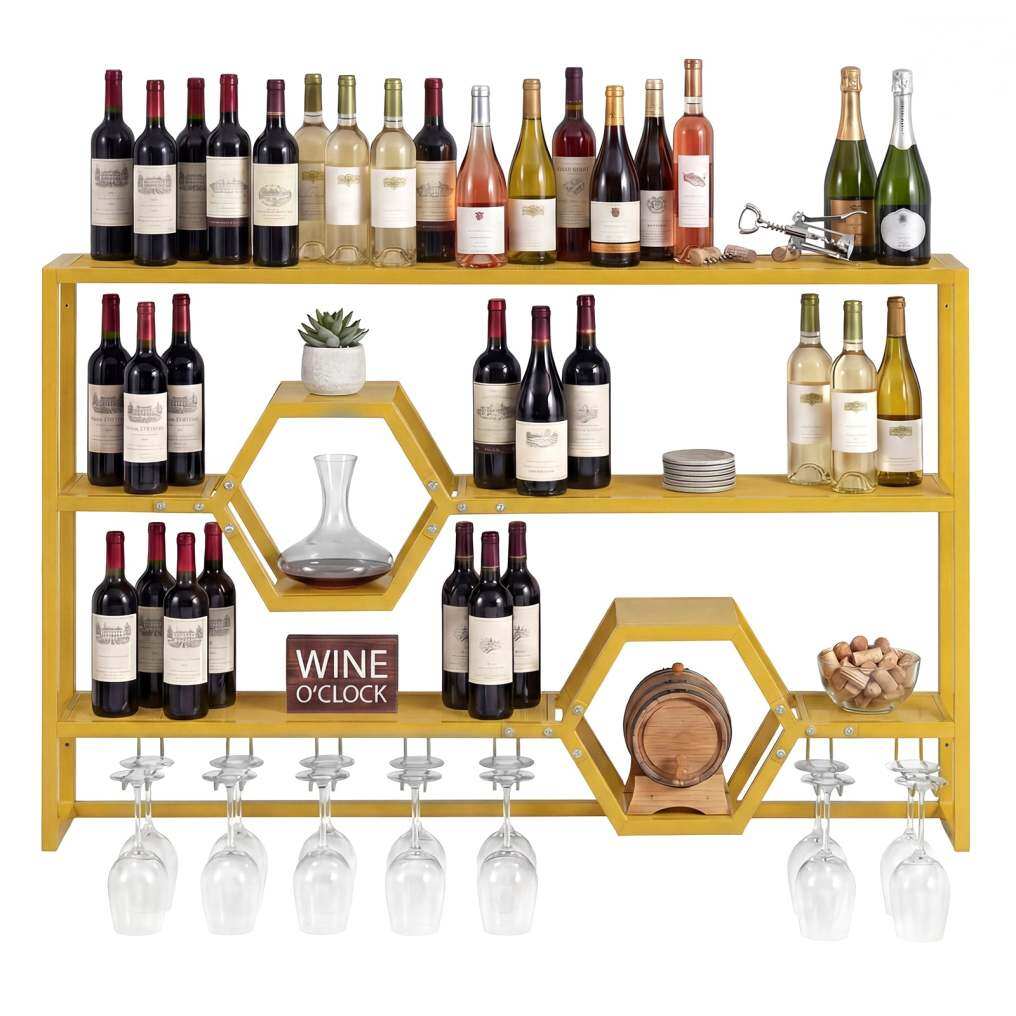 ● Multi-layer Storage Solution: The 47" wall wine rack features 3 floating shelves, 2 honeycomb cubbies and 7 stemware racks, offering organized storage space for your wine bottles, glasses, plants or decorations.