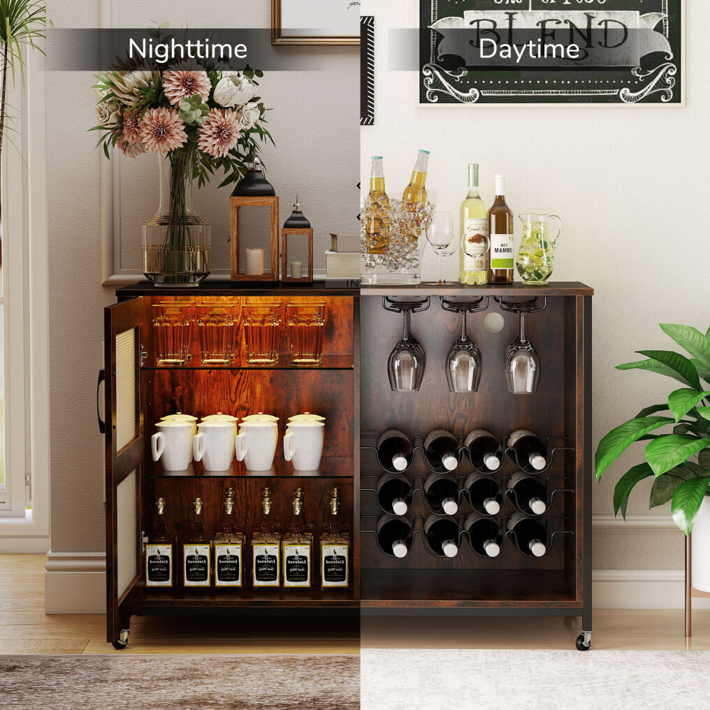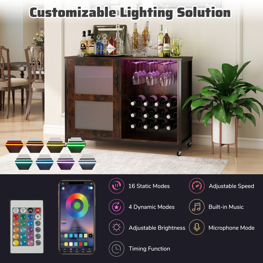 ● Customizable Lighting Solution: Equipped with adjustable LED lights, this wine bar cabinet will illuminate your space with 16 million colors, 16 static colors, 4 dynamic modes, adjustable brightness and speed. There is also built-in music, microphone mode, and timing function, all easily realized by the remote and APP control.