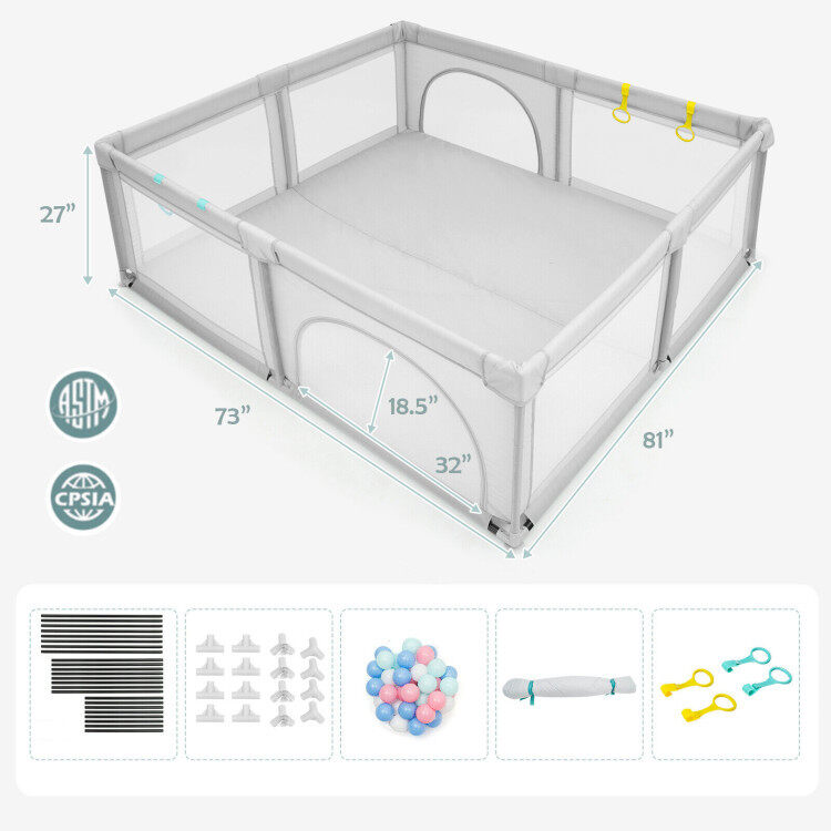 ● Large 81” x 73” x 27” playpen provides a safe, enclosed area for crawling, standing, and walking