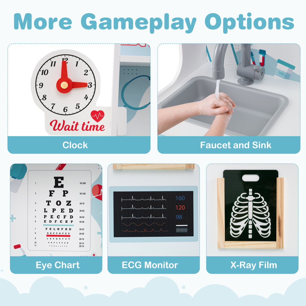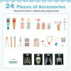 ● Fully Equipped for Imaginative Play: The role play medical toy includes an ECG monitor, vision chart, and X-ray film for realistic medical imaging, along with a spacious examination region and a simulated faucet and sink. Plus, the 24 medical accessories enrich the role-playing experience.