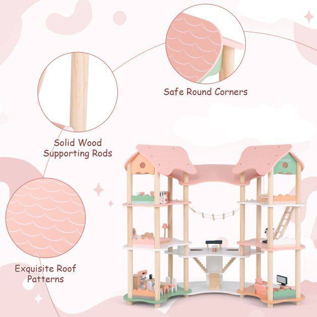 Safe Material and Stable Frame: Crafted with sturdy wood supporting rods and rounded corners, this dollhouse ensures a safe and stable play environment for young explorers. Besides, the smooth, splinter-free surface offers a worry-free playtime.