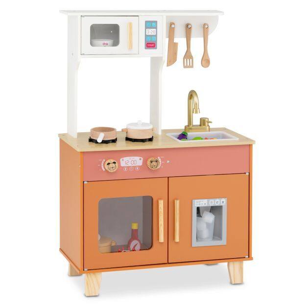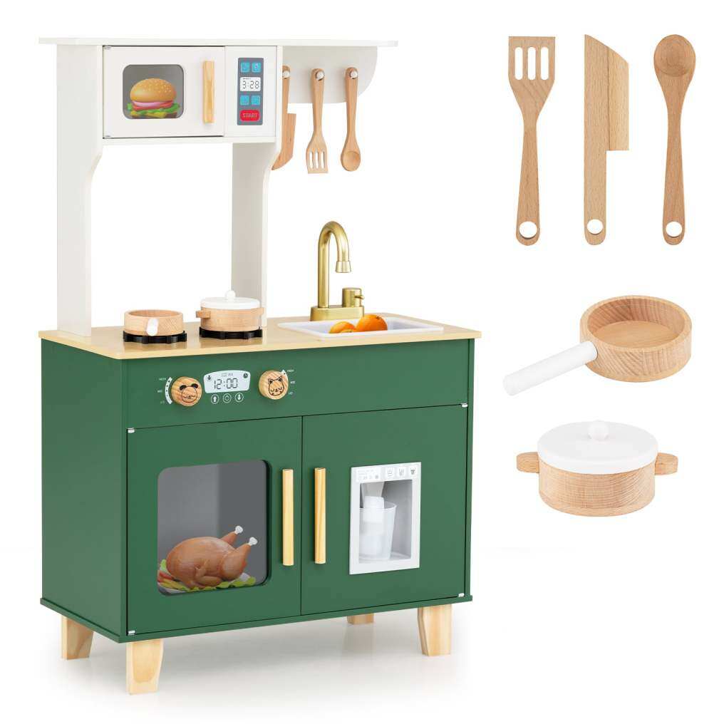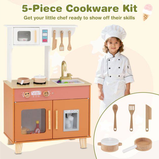 All-in-One Play Kitchen: This wooden play kitchen packs a microwave, swivel faucet sink, 2-burner stove, and a 5-piece cookware kit so kids can cook, clean, and serve just like grown-ups. The interactive ice dispenser adds extra realism—load it with cubes and press the cup to watch them tumble out.