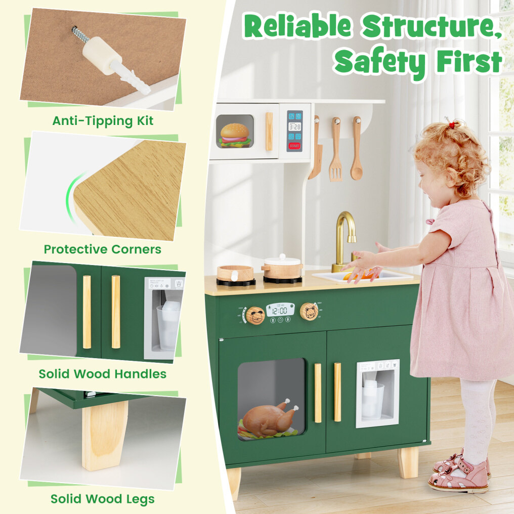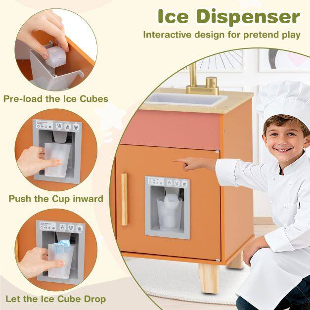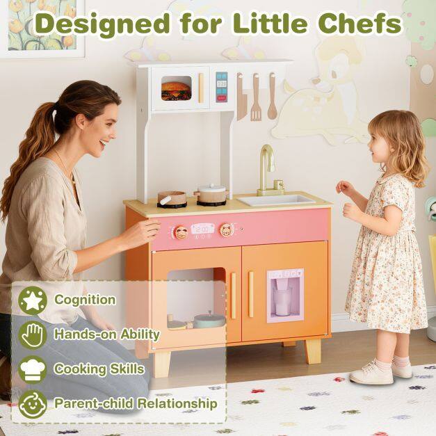 Perfect for youngsters aged 3-6, this enchanting kitchen set includes everything your little chef needs: a microwave, 2-burner stove, swivel faucet sink, plus a fantastic interactive ice dispenser that releases cubes with the press of a cup. But wait—there's more! Smart storage cabinet tucks away all their gadgets neatly, and the entire setup is anchored safely to prevent any tips or spills, backed by our commitment to top safety standards. Spark joy and creativity in your child's daily play with our beautifully crafted kitchen. An outstanding gift for any special day that keeps little hands busy and hearts full of fun! Buy now and watch your little chef cook up a storm in their very own kitchen paradise!