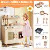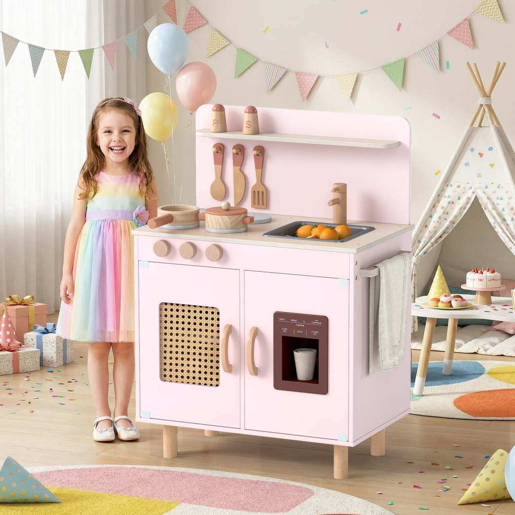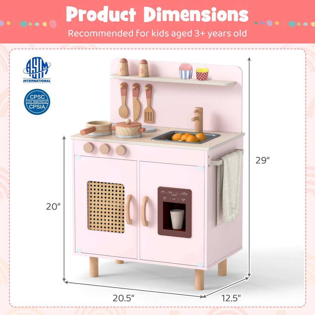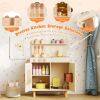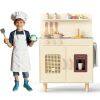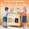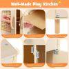 ● Kids-Friendly Material and Safety: Crafted with solid wooden boards, the ASTM/CPSIA compliant cooking toy kitchen prioritizes safety and longevity with rounded corners. Moreover, the elevated sturdy legs ensure stability that parents can rest easy knowing their little ones is playing with a toy that's built to last and secure.