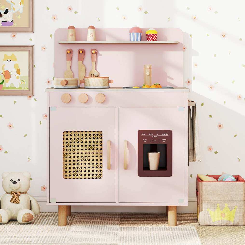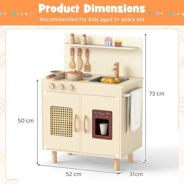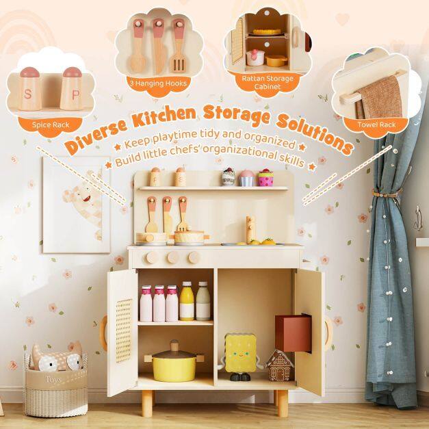 ● Diverse Kitchen Storage Solutions: Featuring a spice rack, hanging hooks for utensils, a rattan storage cabinet with a detachable shelf and a towel rack, this toddler kitchen playset offers diverse storage options to keep accessories organized. Plus, teaching tidiness becomes fun as little chefs learn to put away their cooking utensils.