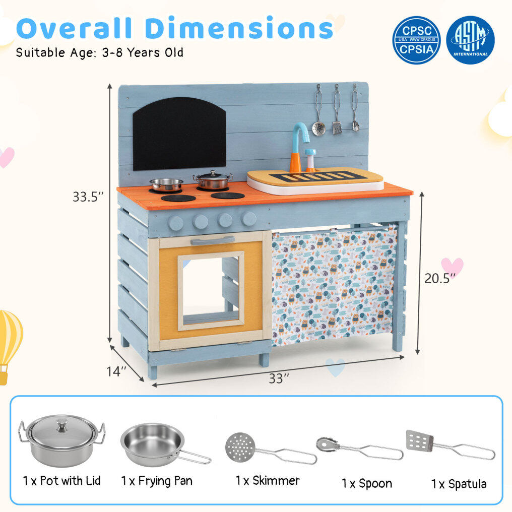 ● Solid Fir Wood Construction: Crafted from natural fir wood, the 33"L x 14"W x 33.5"H toy kitchen promises durability and safety. With its rounded corners, smooth surfaces, and robust legs, parents can have peace of mind while children engage in play.